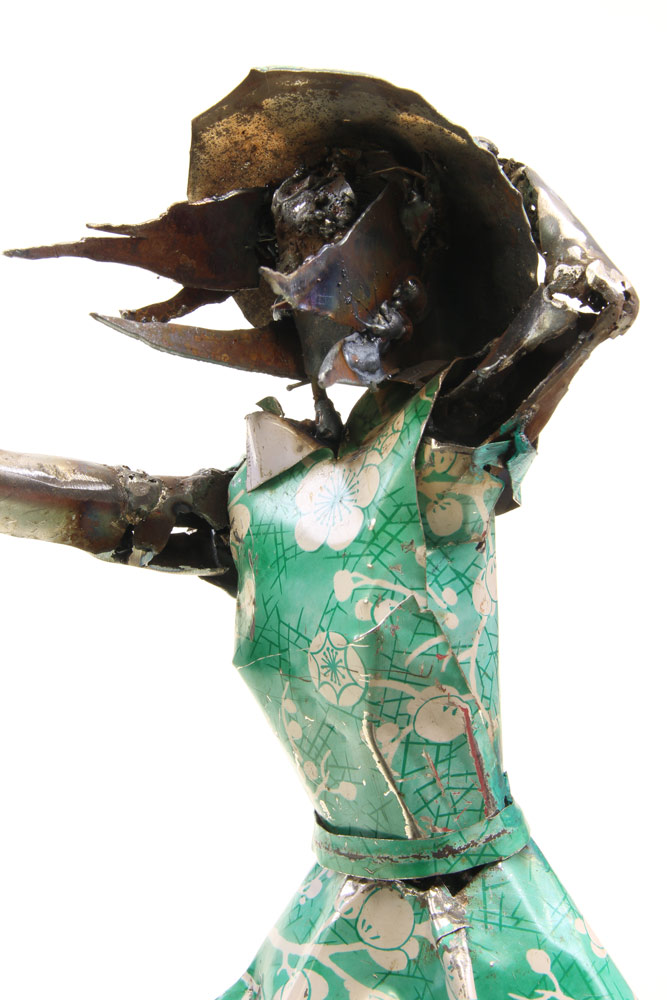 During this time she drew and made cartoon sketches and in her 40’s started making wire sculpture in a similar vein to her sketches, these were very linear works and around 1995 she started using tin and steel in her sculptures, enabling her to make more solid forms.